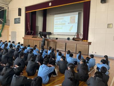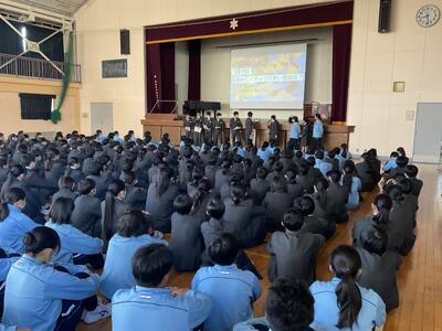 生徒朝会にて図書委員会と緑化委員会による発表がありました。