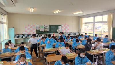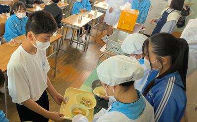 今日から給食が始まりました。1年生にとっては中学校はじめての給食ということで2年生の給食委員が各クラスにお手伝いに行ってくれました。小学校との違いに戸惑ったかもしれませんが、おいしい給食をいっぱい食べて元気に大きく成長してください!