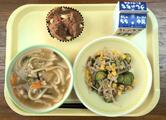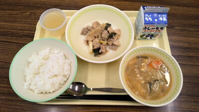 今日の給食:牛乳、焼き鳥丼、呉汁、坂戸はちみつレモンゼリー