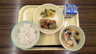 今日の給食:ごはん、牛乳、白玉雑煮、ちくわの香り揚げ、ピリッと白菜