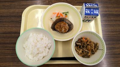 今日の給食:ごはん、牛乳、和風ミートカップ、切り干し大根の煮つけ、浅漬け