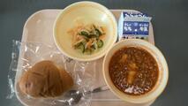 今日の給食:牛乳、トマトソースのハンバーガー、ABCスープ