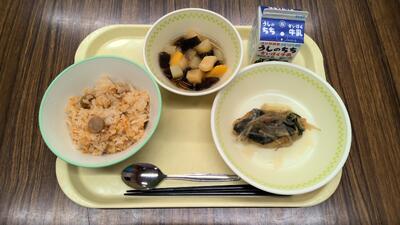 今日の給食:牛乳、ジャンバラヤ、さごしの野菜あんかけ、黒蜜ゼリー入りフルーツポンチ