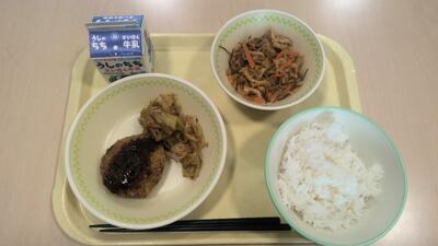 今日の給食:牛乳、ごはん、メンチカツ、切り干し大根の煮つけ、キャベツのおかかあえ