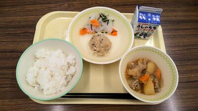 今日の給食:牛乳、ごはん、豆腐シューマイ、中華風肉じゃが、大根のアチャラ漬け