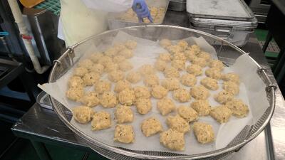 豆腐・鶏肉・たまねぎ・干ししいたけ・しょうが・粗塩・こしょう・砂糖・醤油・酒・でんぷん・ごま油を合わせた具をシューマイの皮の上にのせて形を整えて、大きな釜で蒸してつくりました。