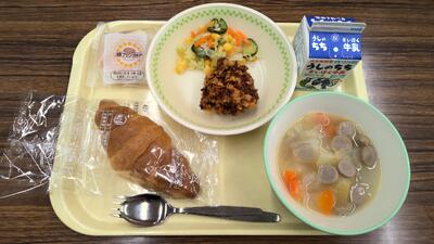今日の給食:牛乳、バターロール、チキンスープスパゲッティ、ごぼうのみそドレッシングサラダ
