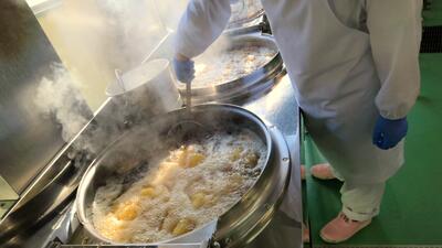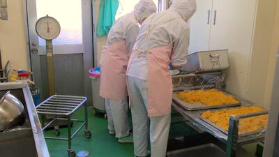 薄く切った豚肉に粉をまぶして油で揚げました。豚肉を一枚一枚はがしてバラバラにするのに、とても手間がかかりますが、みなさんからのリクエストの多いメニューなので調理員さんががんばって作ってくれています。